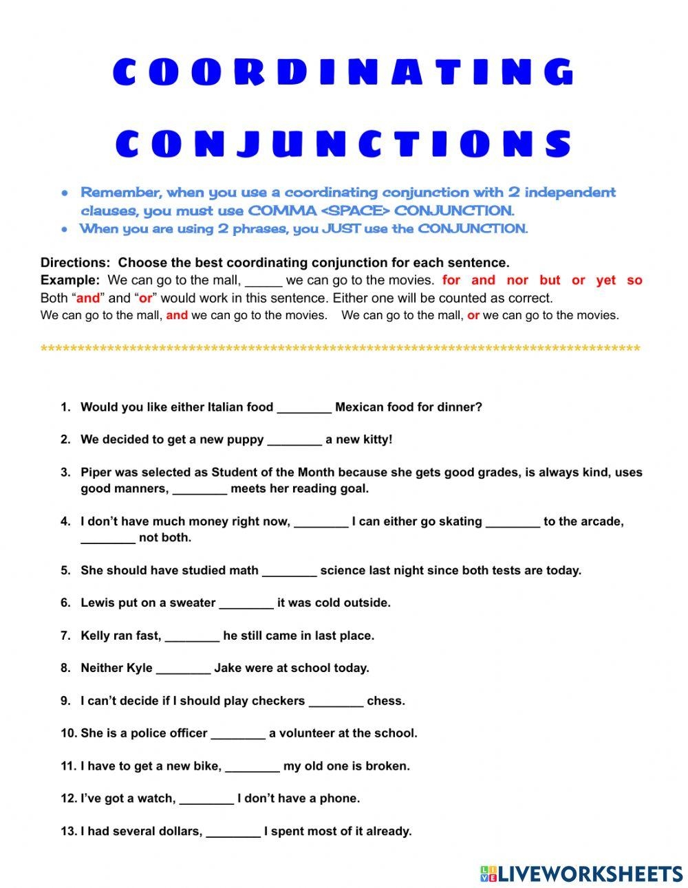 Coordinating Conjunctions Live Worksheets Worksheets Library