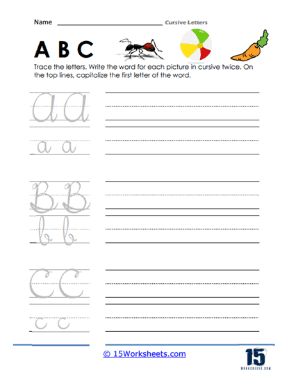 Cursive letters worksheets typically include practice sheets for each letter of the alphabet, both lowercase and uppercase. These worksheets provide guided practice for children to learn and perfect their cursive writing skills. They often include tracing exercises, as well as blank lines for children to write on their own.
