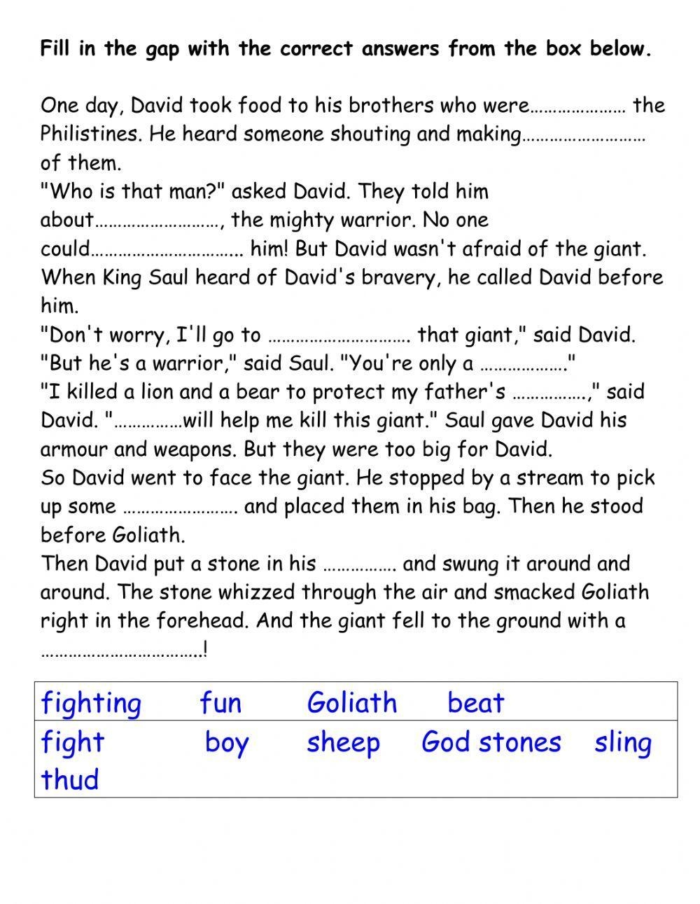 David and Goliath worksheets can come in various forms, including reading comprehension exercises, vocabulary activities, and critical thinking questions. These worksheets are designed to help students not only understand the story better but also to draw out important themes and lessons that can be applied to their own lives.