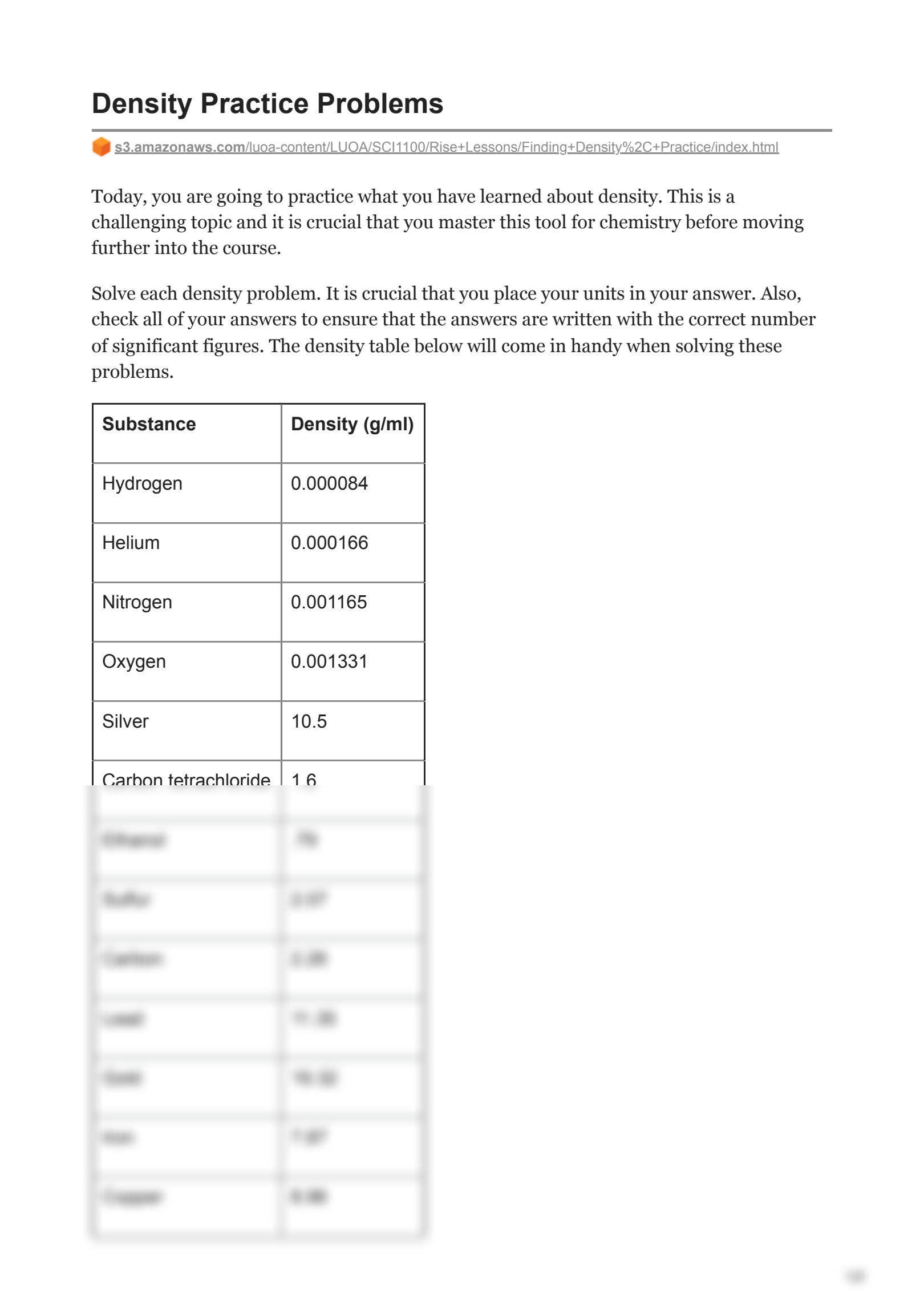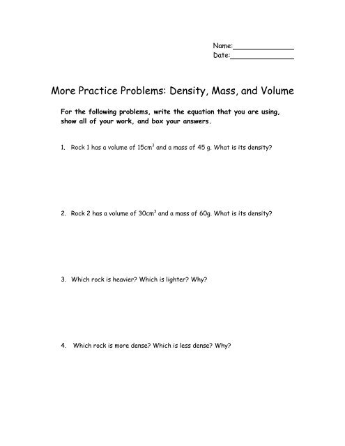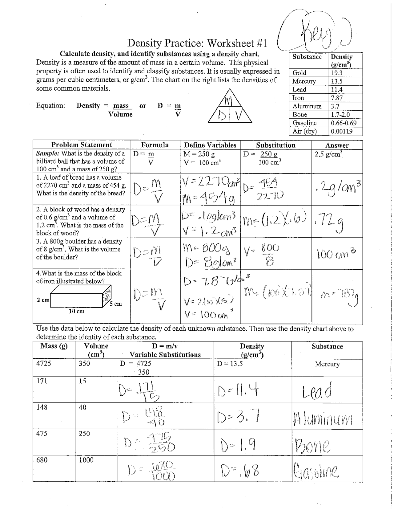 A density practice problem worksheet is a valuable resource for students to test their knowledge and skills in calculating density. These worksheets typically contain a series of problems that require students to calculate the density of various substances using the formula density = mass/volume. By working through these problems, students can gain confidence in their ability to calculate density and apply it to real-world situations.