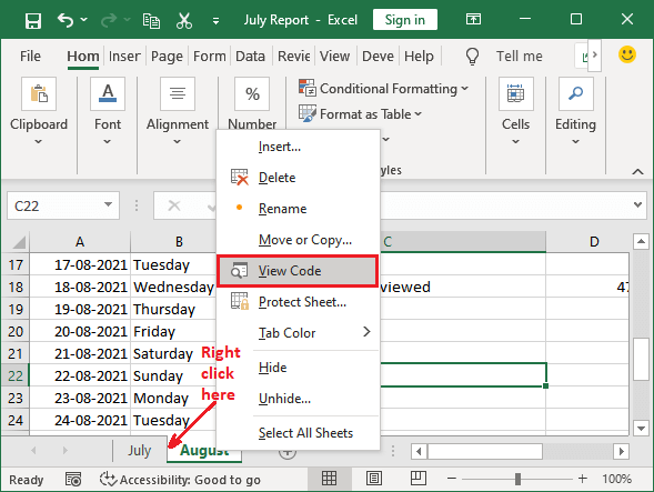 1. Open your Excel workbook and click on the “View” tab in the top menu bar.