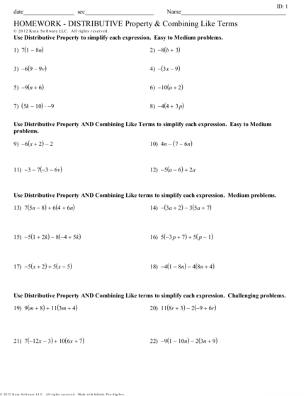 These worksheets typically consist of a series of problems where students are required to apply the distributive property to simplify expressions. By practicing these problems, students can improve their understanding of the distributive property and develop their algebraic skills.
