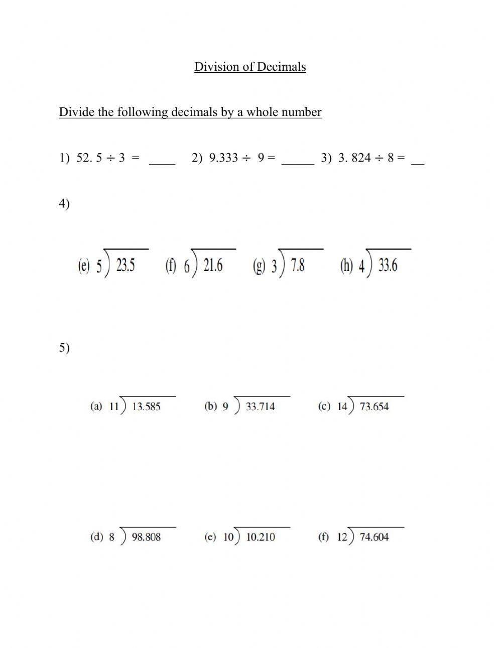 Dividing whole numbers by decimals can be a challenging concept for students to grasp. It requires a good understanding of place value and how decimals work. Worksheets are a great way to practice this skill and reinforce learning. By providing students with a variety of problems to solve, they can improve their proficiency in dividing whole numbers by decimals.