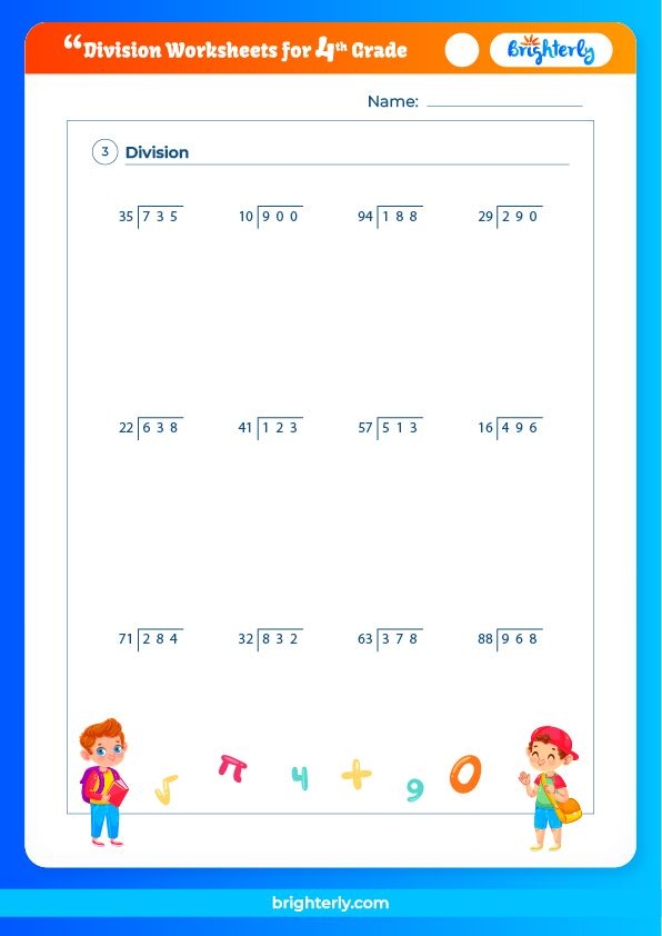 Division worksheets for grade 4 also provide students with a structured way to practice division problems. These worksheets typically include a variety of exercises that target different division skills, such as dividing by single-digit numbers, dividing with remainders, and long division. By working through these problems, students can build their confidence and improve their division fluency.