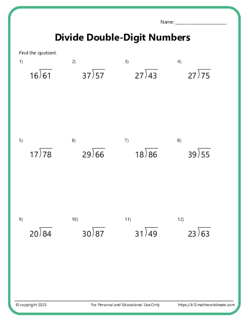 In conclusion, double digit division worksheets are an effective and practical way for students to practice and improve their division skills. By working through a series of problems, students can build their confidence and proficiency in dividing two-digit numbers, ultimately leading to greater success in math. Teachers can also benefit from using these worksheets as a tool for assessing student understanding and providing targeted support. Overall, double digit division worksheets are a valuable resource for both students and teachers in the pursuit of mathematical proficiency.