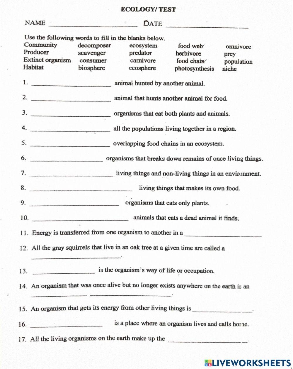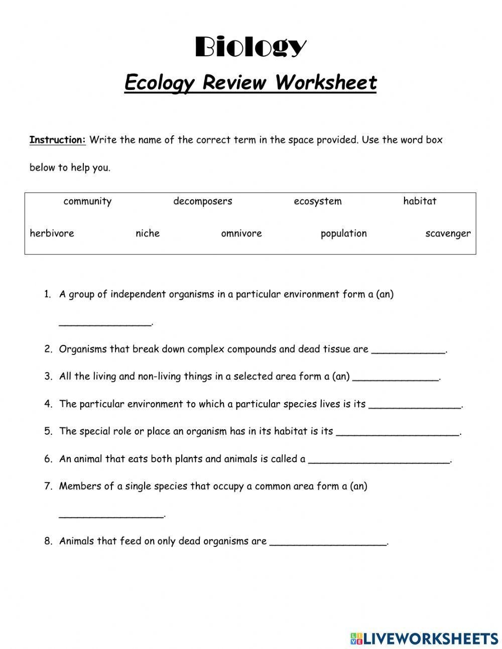 Ecology worksheets are a great way to engage students in learning about the environment and the relationships between different organisms. These worksheets can cover a wide range of topics, from food chains and ecosystems to biodiversity and conservation. They are a valuable tool for educators to assess students’ understanding of key ecological concepts.