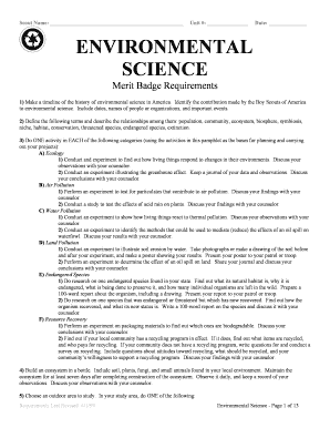The Environmental Science Merit Badge worksheet is a tool used by scouts to track their progress in completing the requirements for the Environmental Science Merit Badge. It contains a list of activities and tasks that scouts must complete in order to earn the badge. These activities often involve researching environmental topics, conducting experiments, and participating in field trips to observe nature firsthand.