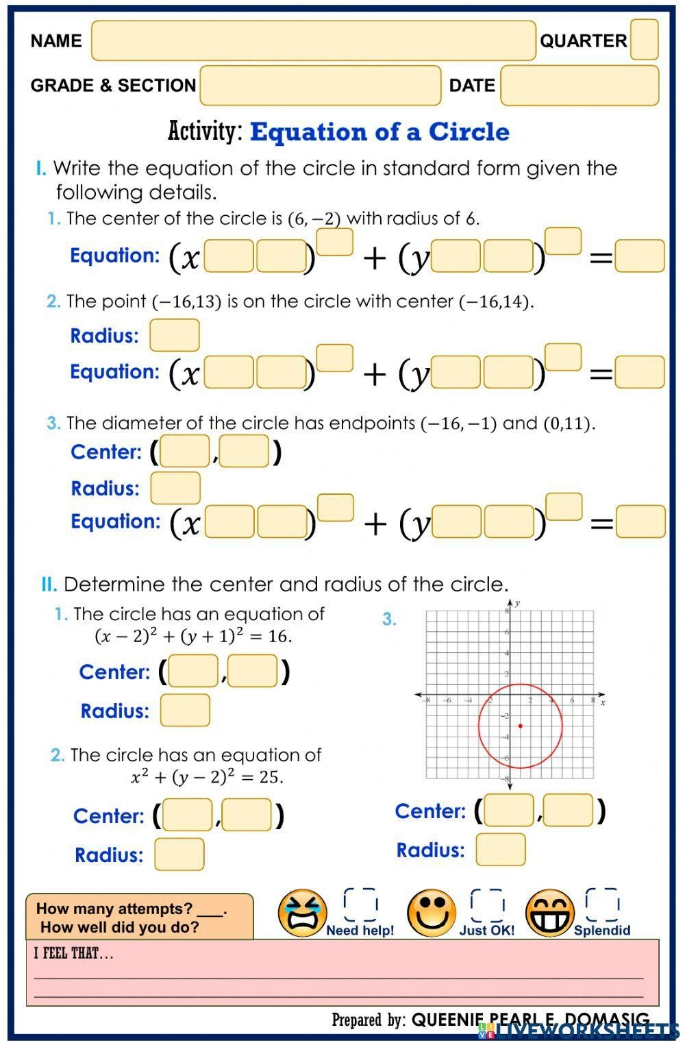 A worksheet on the equation of the circle typically includes various problems that require students to find the equation of a circle given its center and radius, or to determine the center and radius of a circle based on its equation. These problems help students practice the necessary algebraic manipulations and geometric reasoning required to work with circles efficiently.