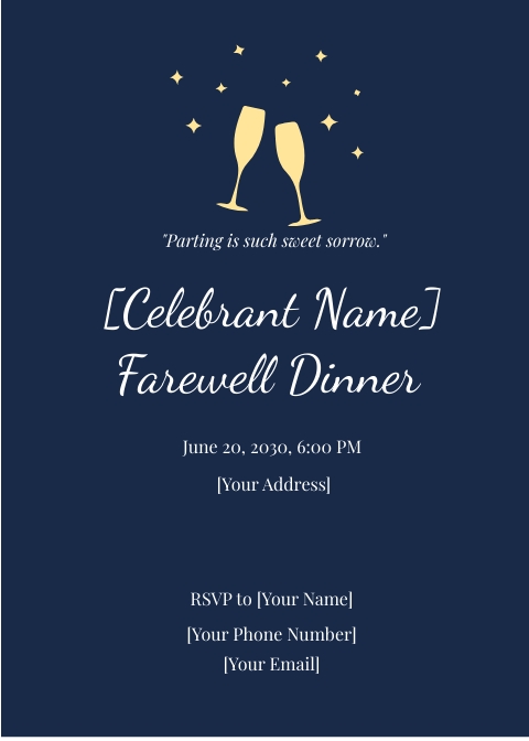 We are excited to invite you to a farewell dinner in honor of our beloved colleague [Name]. The event will be held on [Date] at [Time] at [Location]. Please join us as we celebrate their time with us and wish them all the best in their future endeavors.