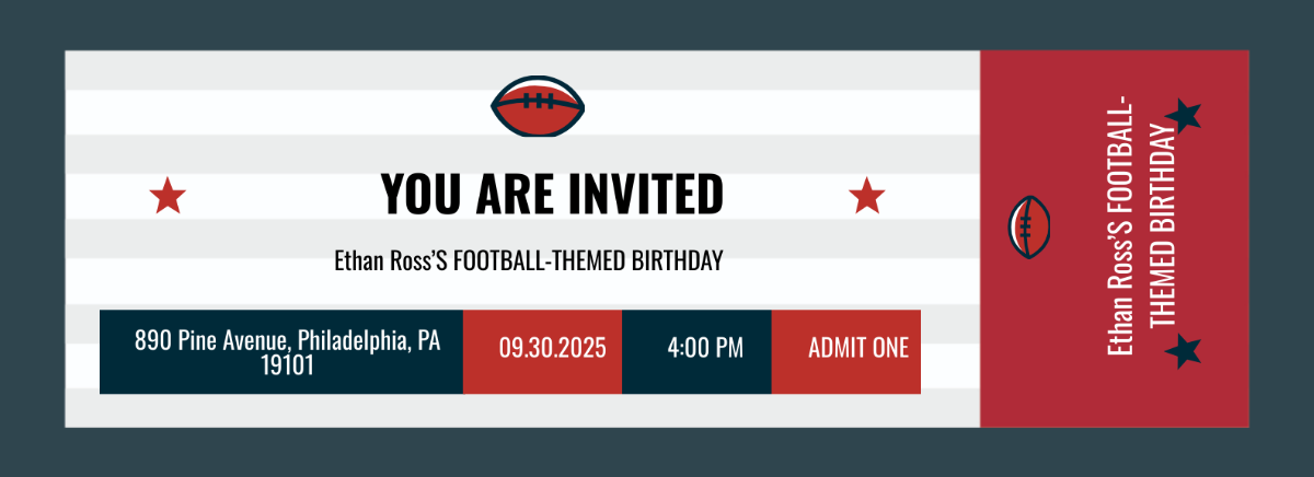 Get your game face on and start creating your custom invitations with our free football ticket birthday invitation templates. Your guests will be thrilled to receive such a unique and personalized invitation that sets the tone for a fun and festive birthday celebration. Download your template now and get ready to score big with your football-themed party!