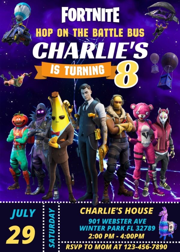 Whether your child is a seasoned Fortnite player or just a fan of the game, our invite template is sure to get them excited for their special day. With options to add their name, age, party date, time, and location, you can create a personalized invitation that will make them feel like the star of the party.