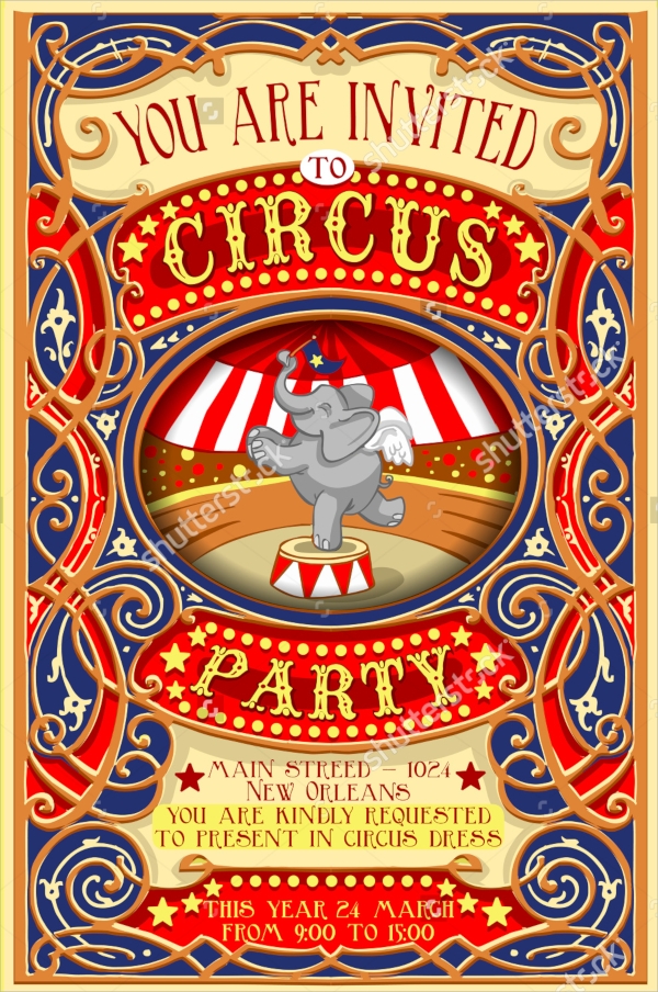 3. Animal Friends: Who can resist the charm of circus animals? These templates showcase adorable elephants, lions, and clowns to add a cute and playful touch to your invitations. Perfect for a children’s party or a family-friendly event.