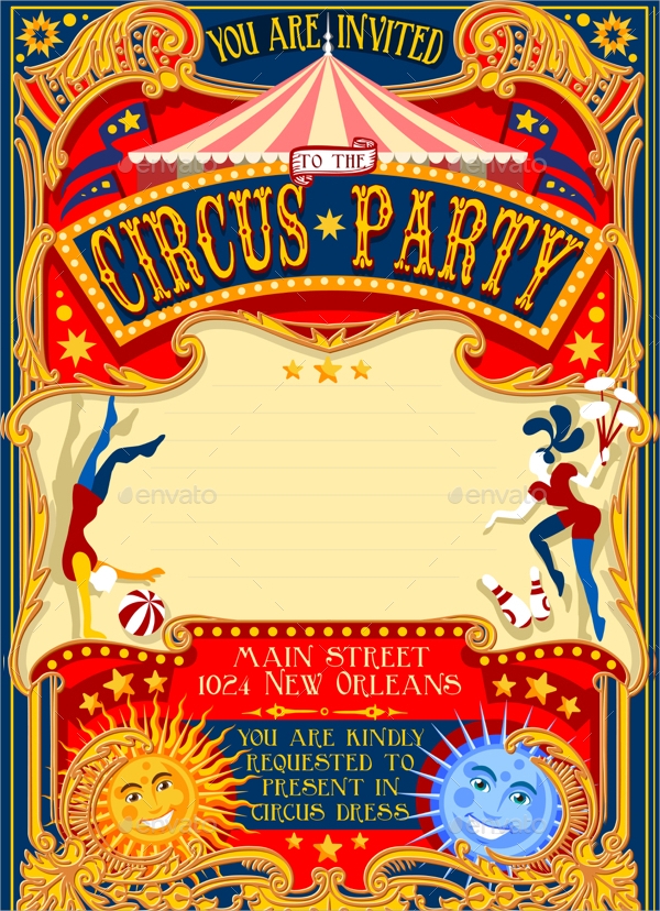 4. Big Top Extravaganza: For a grand and extravagant circus party, these templates will make a statement. Featuring bold stripes, dazzling stars, and a larger-than-life circus tent, your guests will know they’re in for a show-stopping celebration.