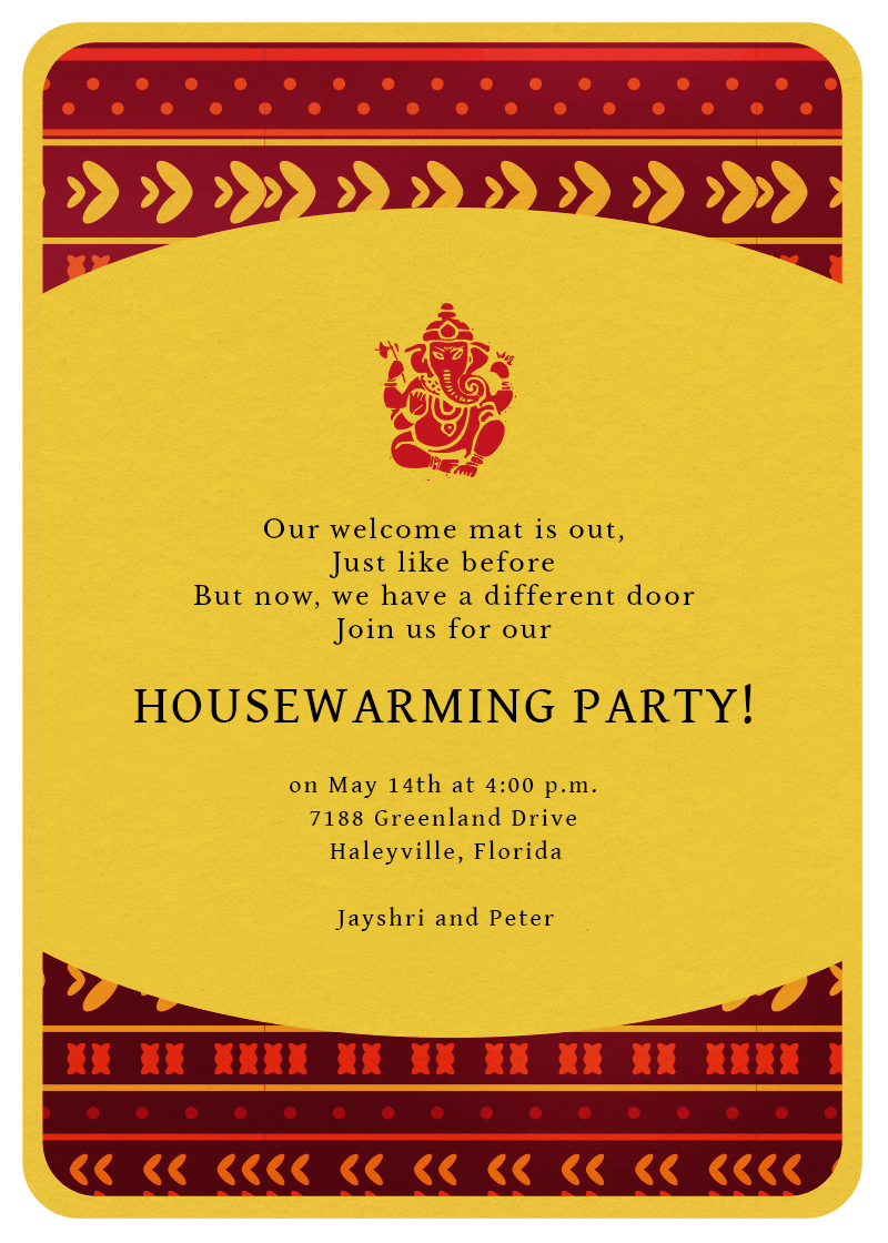 Celebrate this new chapter in your life with style and flair by using our free editable housewarming invitations with an Indian theme. Your guests will be delighted to receive such a beautifully designed invitation, setting the tone for a memorable and festive housewarming party in your new home.