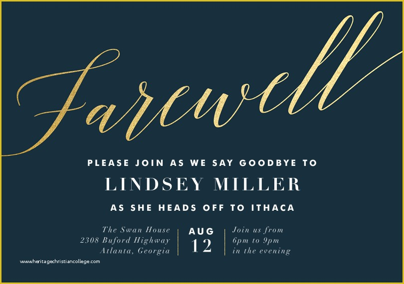 This template features a minimalist design with a sleek font and a black and white color scheme. It is perfect for a formal farewell party or a corporate event. Simply fill in the details of the event, such as the date, time, and location, and customize it with a personal message for the guest of honor.