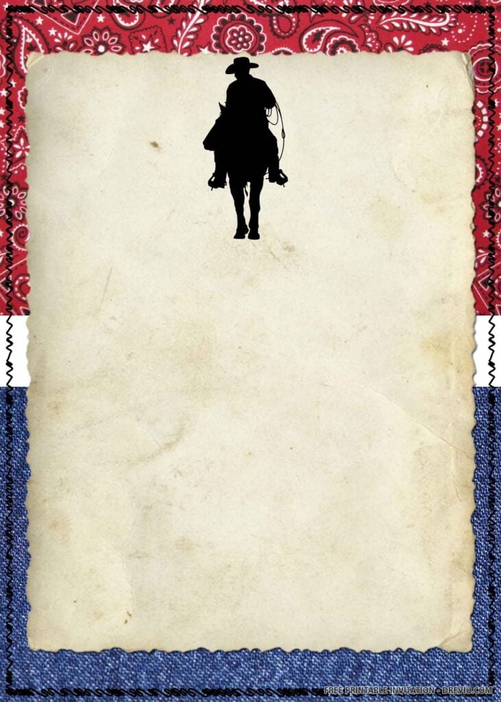 3. Western Bandana Invitation: For a more traditional cowboy look, opt for a western bandana invitation. This template includes a classic bandana print border and space for all your party details in the center. Print on cardstock for an extra special touch.