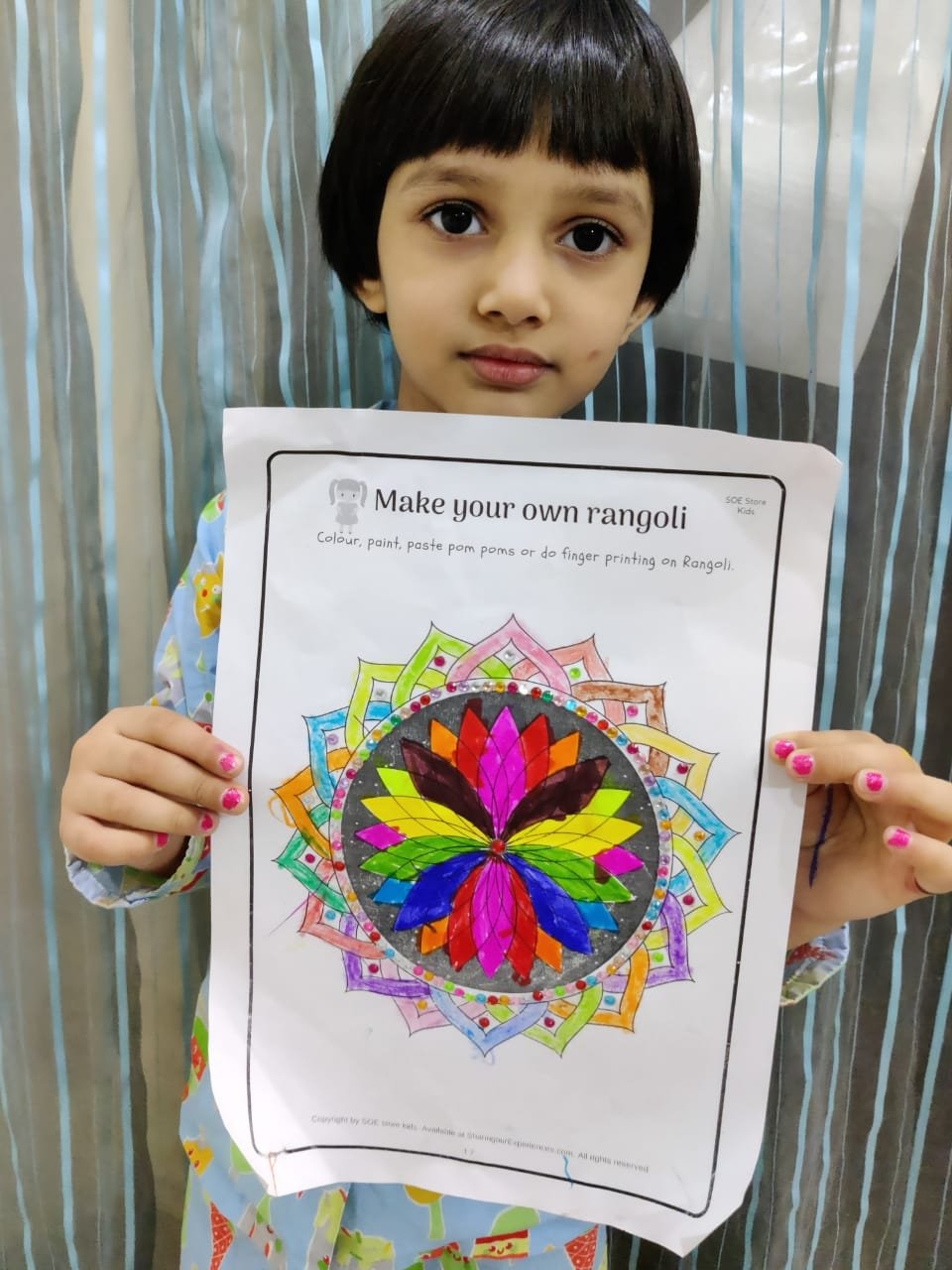 3. Rangoli Patterns: Print out simple rangoli patterns for your toddler to color or trace. Rangoli is a traditional art form in India where colorful patterns are created on the floor using rice flour, colored powders, or flower petals. This activity will introduce your toddler to this beautiful tradition.