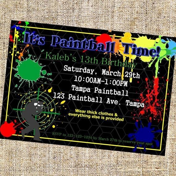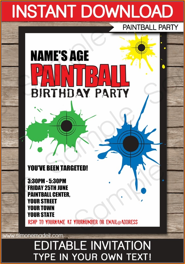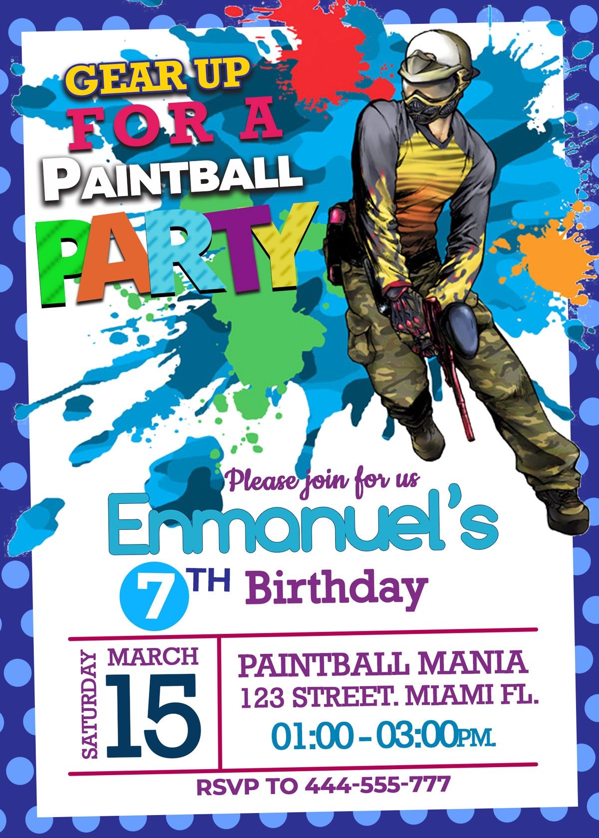 1. Paintball Splatter Invitation: This colorful invitation features paintball splatters and a fun, modern font. Simply download the template, fill in your party details, and print as many copies as you need.
