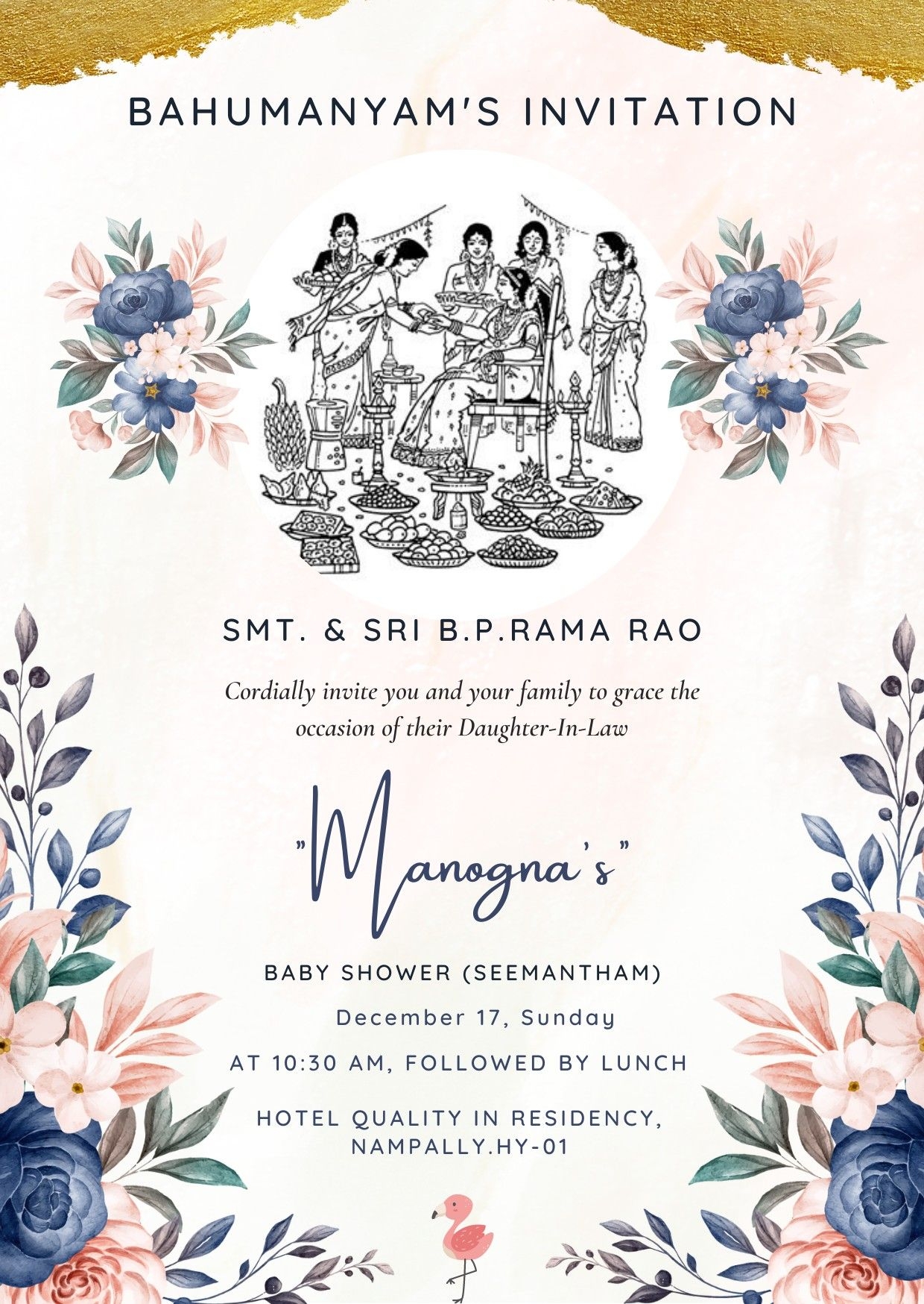 Don’t stress about spending money on expensive invitations when you can use our free template to create stunning Seemantham invitations. Save time and resources while still impressing your guests with a professionally designed invitation. Download our template today and start planning your Seemantham celebration with ease!