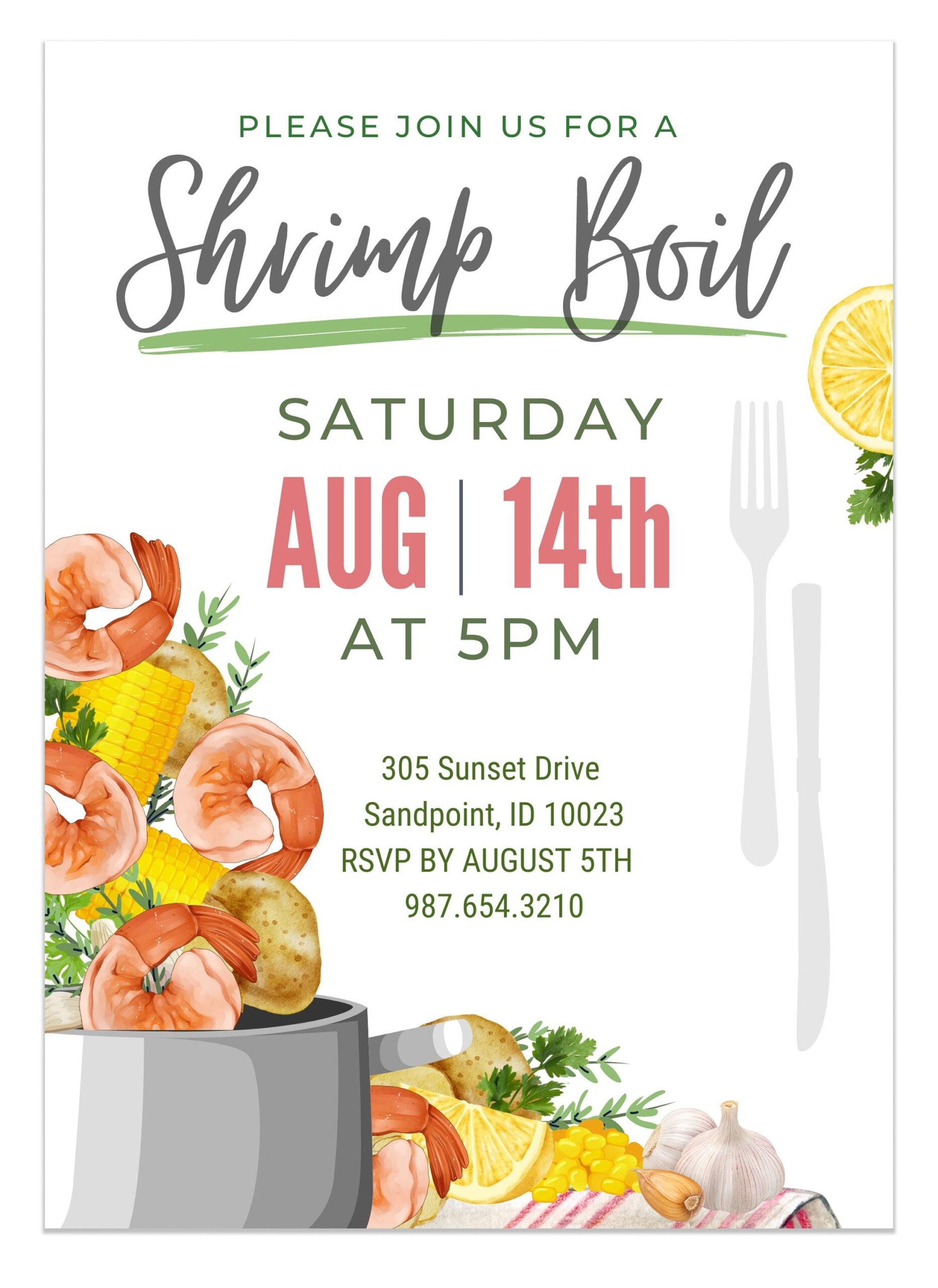 Don’t forget to include RSVP information on your invitation so you can get an accurate headcount for your party. This will help you plan for food and seating arrangements. With a well-designed invitation, your shrimp boil party is sure to be a success.