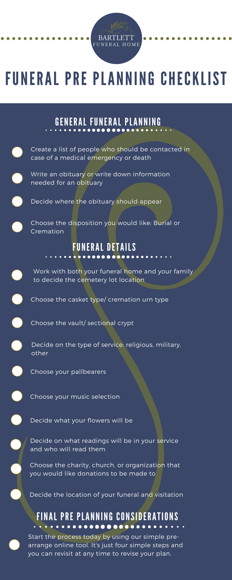 Next, you will need to consider the logistics of the funeral, such as choosing a funeral home, selecting a burial plot or cremation service, and deciding on the date and time of the service. You will also need to think about any special requests or customs that the deceased may have had, such as religious or cultural traditions.