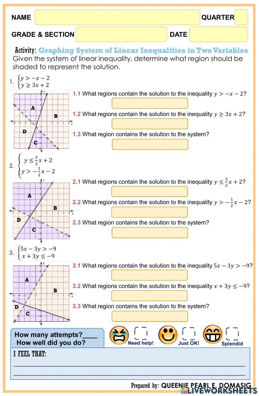 Worksheets on graphing systems of inequalities provide students with practice in representing multiple inequalities graphically and identifying the solution set. These worksheets typically include a series of inequalities to graph and may also require students to shade the regions that satisfy all the inequalities. It’s a hands-on way for students to engage with the concepts and develop their graphing skills.