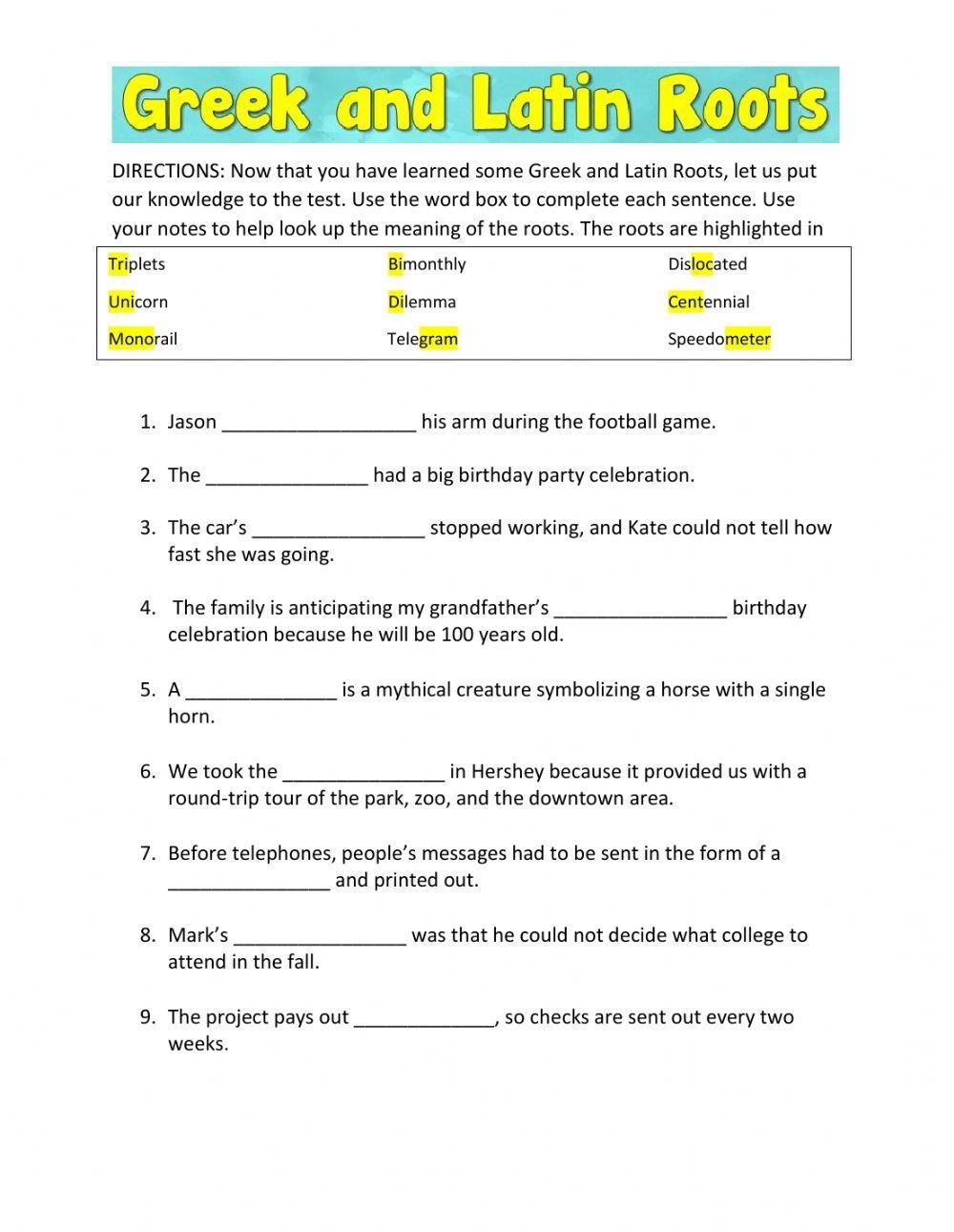 In addition, using worksheets to practice Greek and Latin roots provides a structured and systematic approach to language learning. By organizing roots into categories and providing ample examples for practice, students can progress at their own pace and track their improvement over time. This methodical approach ensures a comprehensive understanding of the material.
