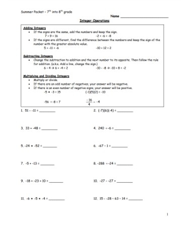 Download and Print integer operations worksheet pdf Listed below