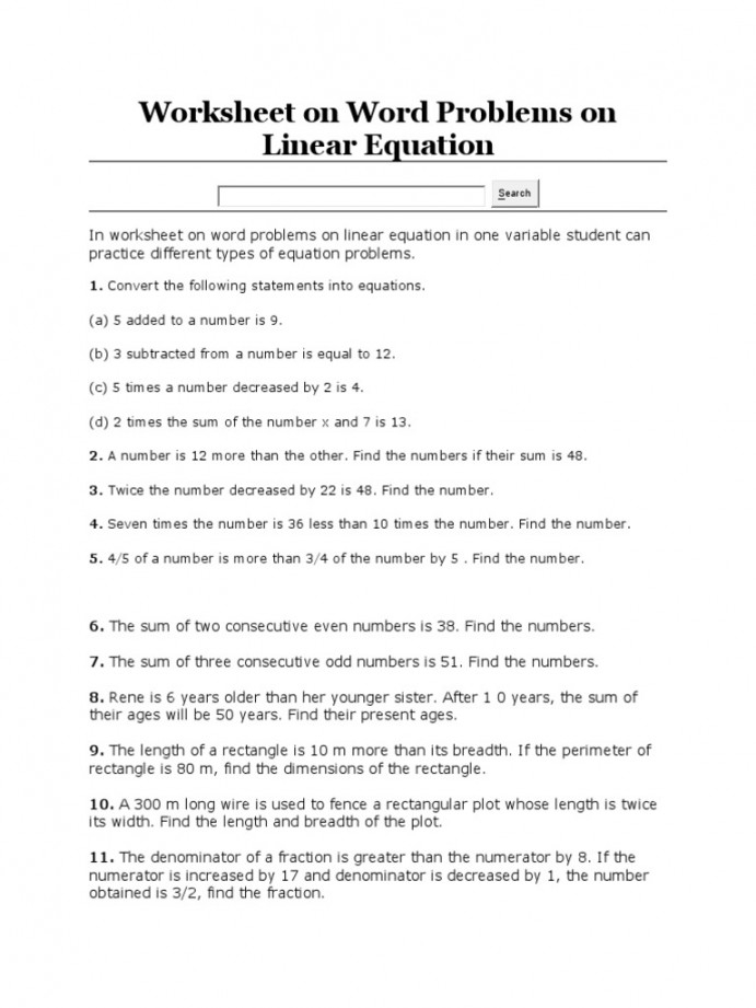 For example, a typical problem on a linear equations word problems worksheet might involve a scenario where a person is driving a car at a constant speed. The worksheet would provide information about the distance traveled and the time taken, and students would need to set up an equation to find the speed of the car. By solving the equation, students can determine the speed at which the car is traveling.