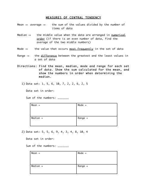 A measures of central tendency worksheet typically consists of a series of data sets for which students are asked to calculate the mean, median, and mode. These worksheets are designed to help students practice their understanding of these concepts and improve their ability to interpret data. By working through these worksheets, students can gain a deeper understanding of how to analyze and summarize data effectively.
