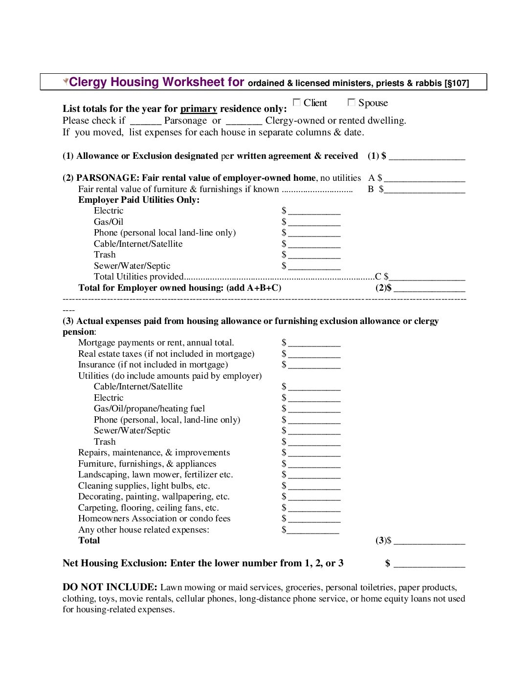Ministers Housing Allowance Worksheet