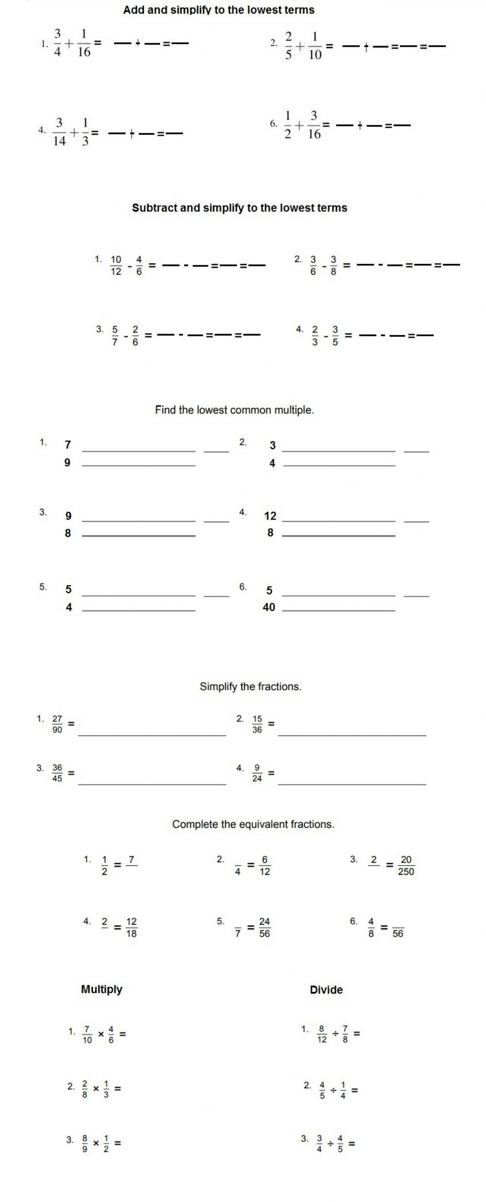 Year 7 ADD SUBTRACT MULTIPLY And DIVIDE FRACTIONS WORKSHEETS
