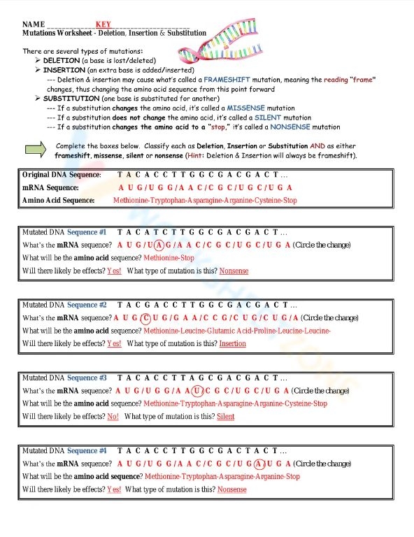 In conclusion, mutations worksheet deletion, insertion, and substitution are important concepts in the field of genetics. These mutations can have various effects on an organism’s traits and characteristics, leading to genetic disorders, evolution, and other biological processes. By studying mutations and their implications, scientists can gain valuable insights into the intricate workings of the genetic code.