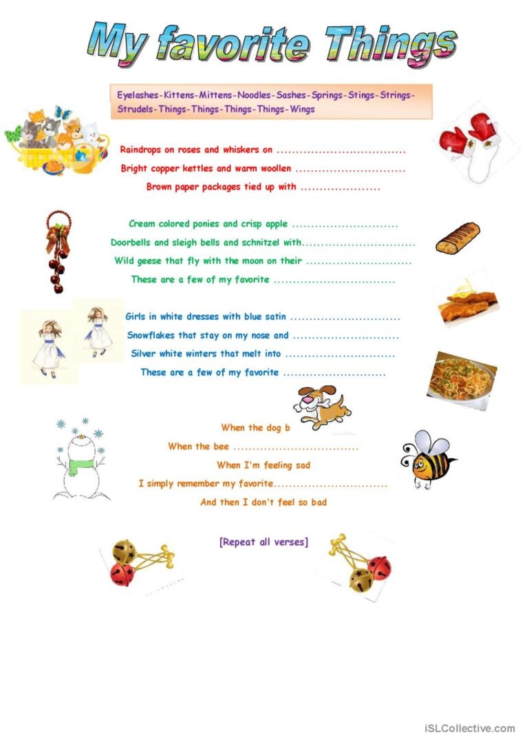 Have you ever taken the time to sit down and think about all the things that bring you joy and make you happy? The My Favorite Things Worksheet is a great tool that allows you to do just that. By listing out your favorite things, you can gain a better understanding of what truly brings you happiness and fulfillment in life. It’s a simple yet powerful exercise that can help you appreciate the little things that make life worth living.