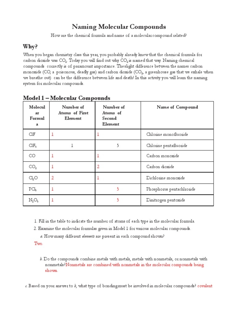 One common tool that teachers use to help students practice naming molecular compounds is a worksheet. These worksheets typically contain a series of questions that require students to identify the elements present in a compound and determine the correct name for that compound. By working through these worksheets, students can reinforce their understanding of the rules for naming molecular compounds and improve their skills in this area.