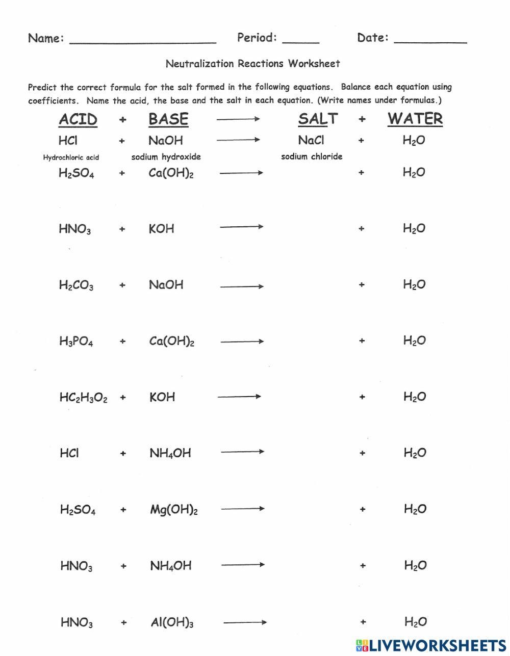 Acid Base Reactions Worksheet Fresh Neutralization Reactions Worksheet