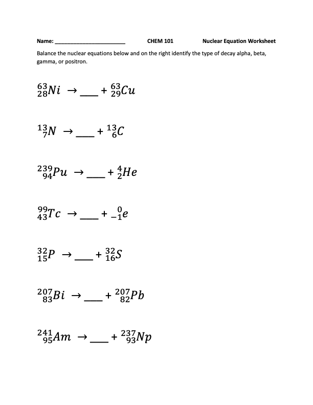 A nuclear decay worksheet is a valuable tool for students and researchers to practice and understand the concept of nuclear decay. These worksheets typically include questions related to radioactive decay, half-life, types of radiation, and decay equations. By working through these worksheets, individuals can improve their knowledge and skills in nuclear physics.