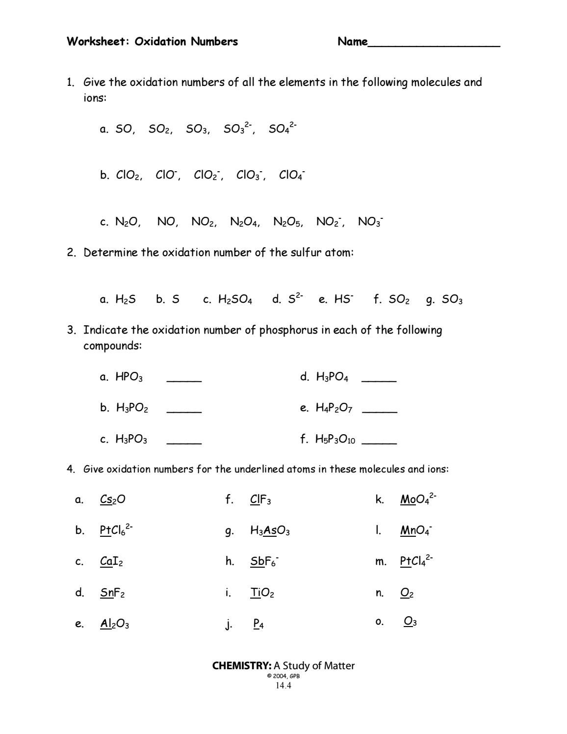 Understanding oxidation numbers is essential in chemistry as they help determine the charge of an atom in a compound. A worksheet on oxidation numbers can be a useful tool for students to practice and reinforce their understanding of this concept. By working through various examples and problems, students can enhance their knowledge and skills in assigning oxidation numbers to different elements.