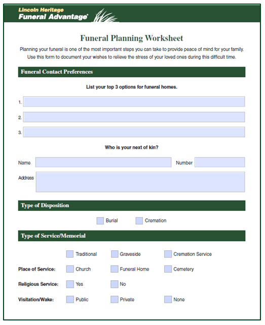 By taking the time to plan your own funeral and create a worksheet outlining your wishes, you can have peace of mind knowing that your final arrangements will be handled according to your preferences. This can also provide comfort to your loved ones during a difficult time, knowing that they are honoring your wishes.