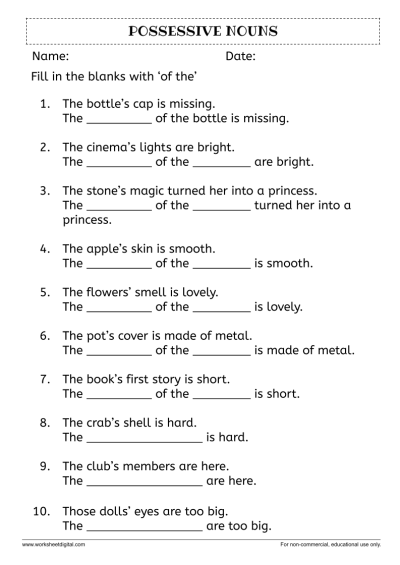 A possessive nouns worksheet is a helpful tool for students to practice identifying and using possessive nouns correctly. These worksheets typically include sentences or phrases with missing possessive nouns that students must fill in. They may also include exercises where students have to rewrite sentences to make them possessive or choose the correct form of a possessive noun.