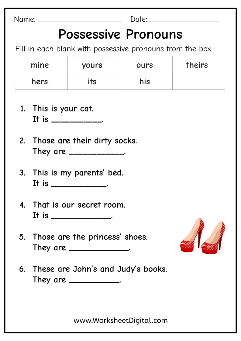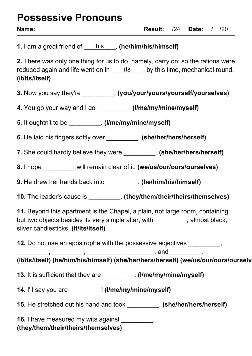 Some possessive pronouns worksheets also include sentence completion tasks where students need to write their own sentences using possessive pronouns. This exercise encourages students to apply their knowledge of possessive pronouns in context and develop their writing skills.