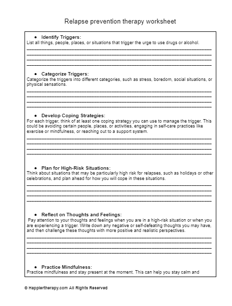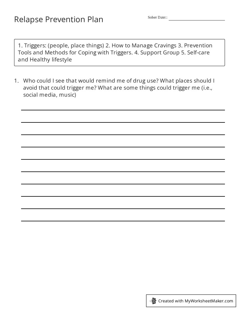 One key component of relapse prevention worksheets is identifying triggers. By recognizing the people, places, and emotions that may lead to relapse, individuals can better prepare themselves for these situations. Worksheets can help individuals list their triggers and develop strategies to avoid or cope with them.