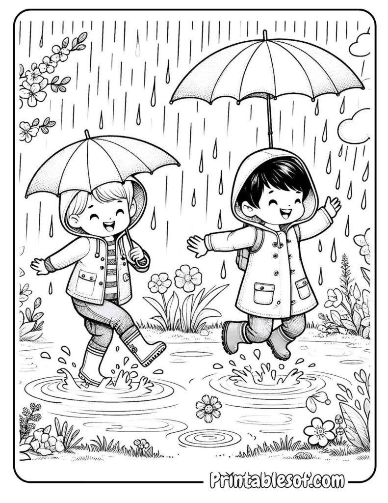 Another fun rain coloring page includes a scene of a city street during a rainstorm, with cars splashing through puddles and people running for cover under their umbrellas. This page allows kids to experiment with different colors to create a vibrant and dynamic rainy day scene.