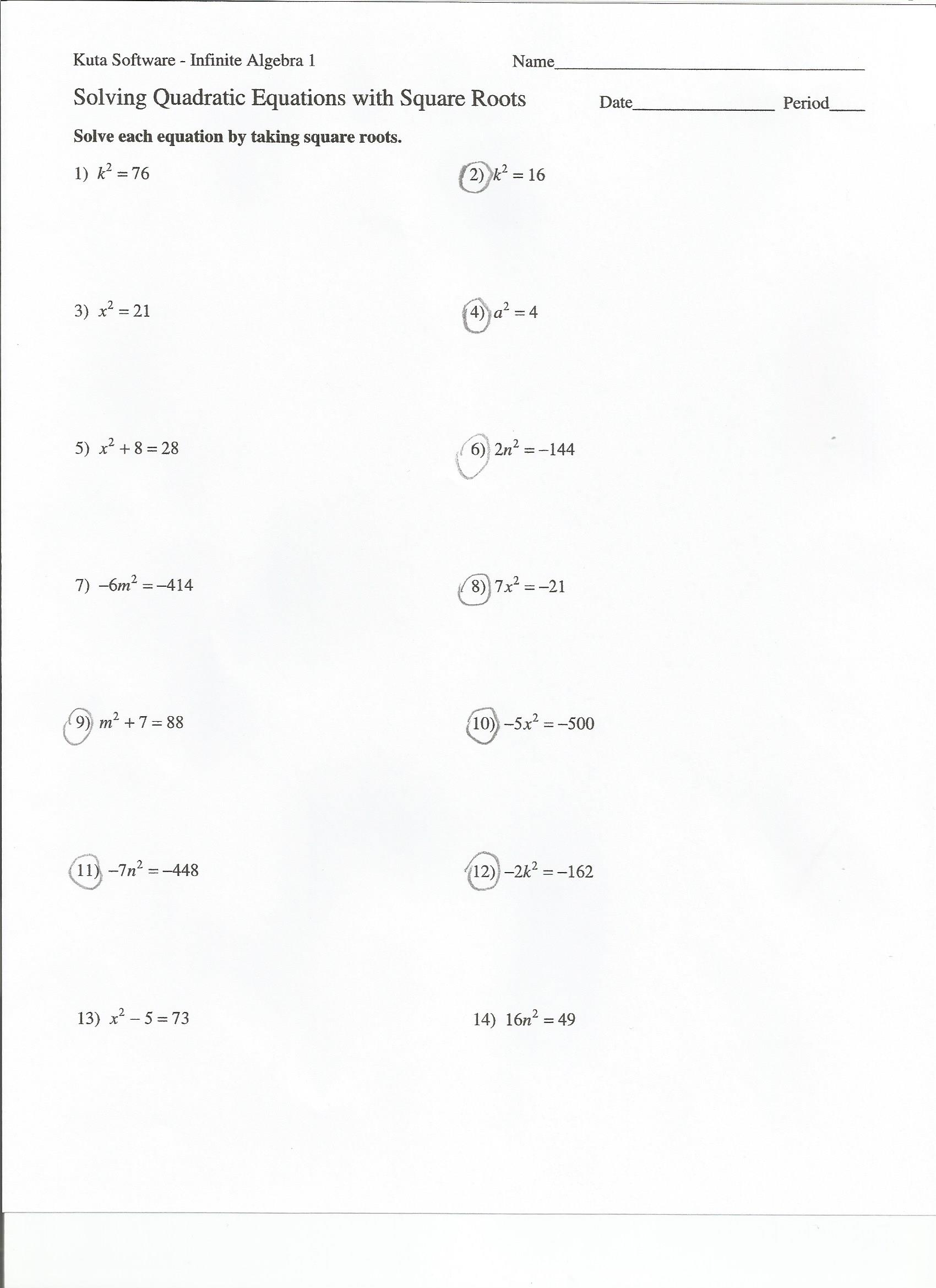 Solving Quadratics with Square Roots Worksheet